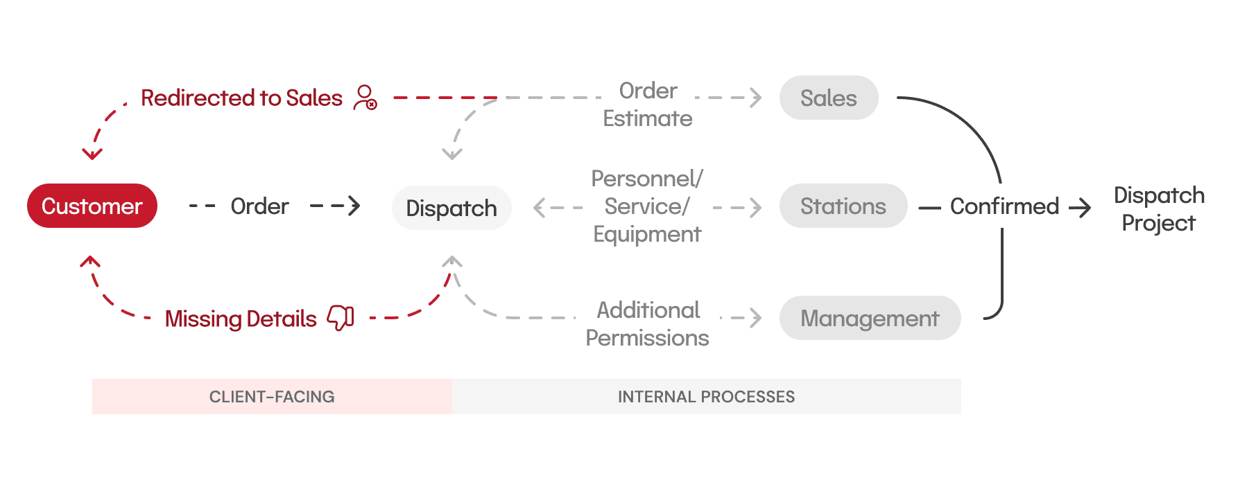 From my research, I found a larger problem than just customers struggling to place orders: the dispatch team was facing challenges managing multiple communication channels, with a heavy reliance on manual tools such as handwritten notes, back-and-forth messages, and outdated spreadsheets.