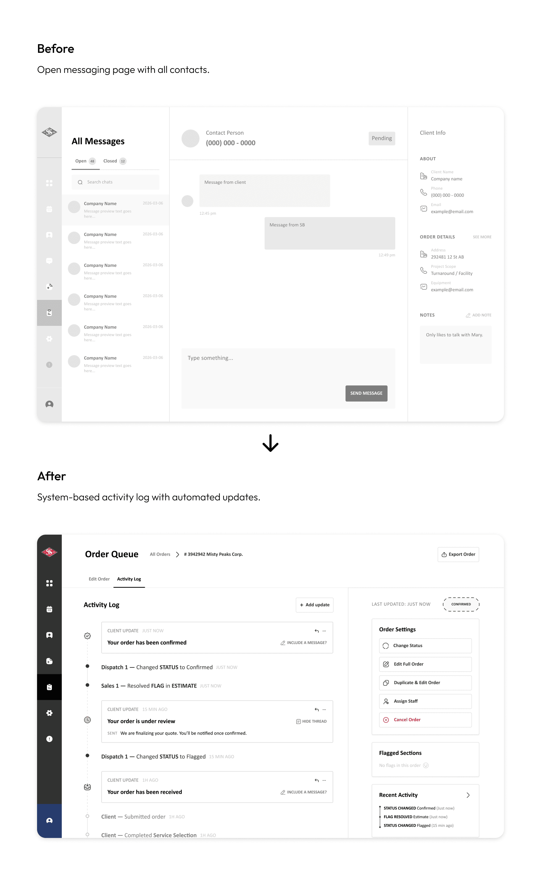 From this, I proposed a new approach: a system-based activity log that tracks activity within each order, the user who created the change, and links it to the system to push updates to the customer to signal progress.