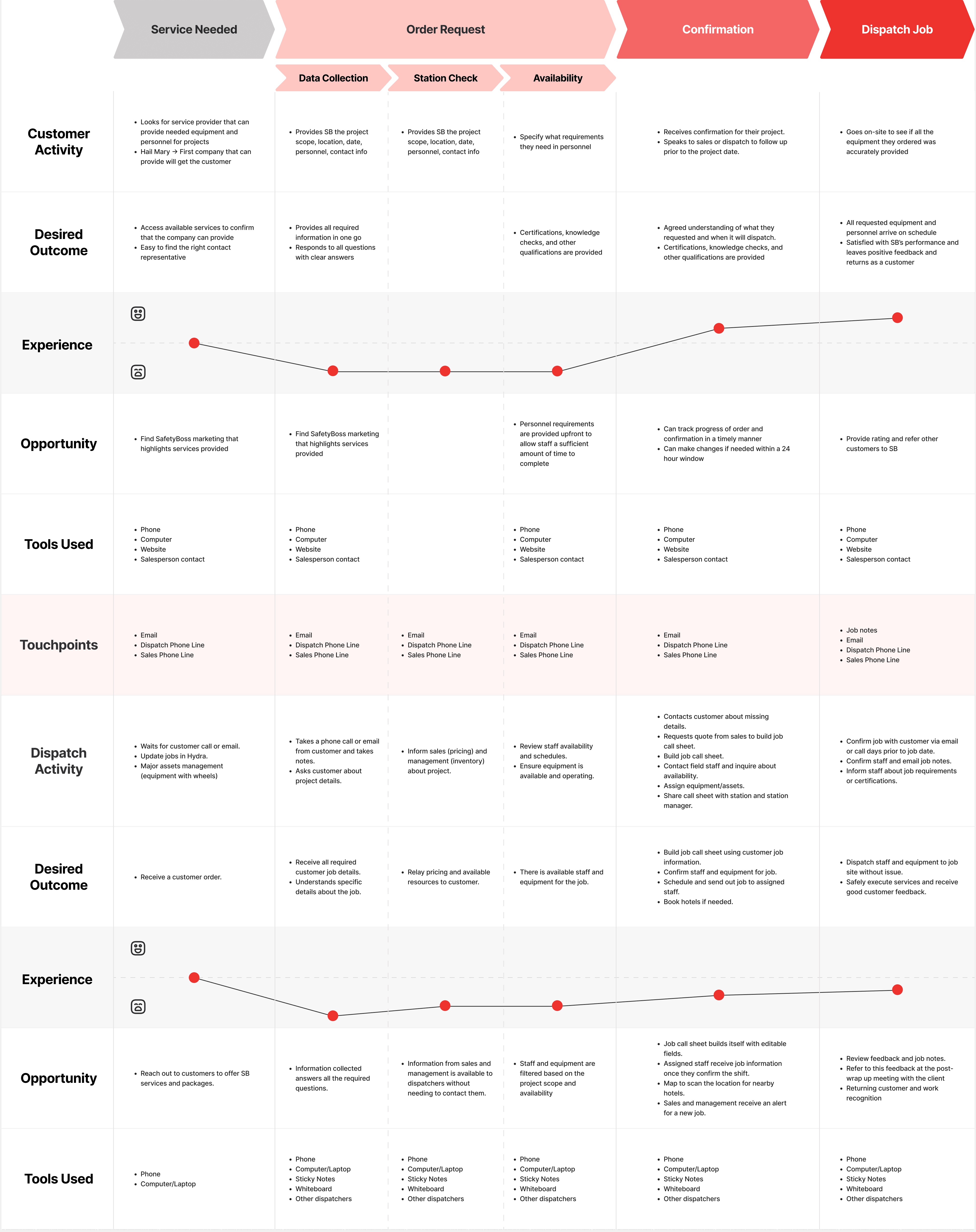The journey map outlines the start to end user journey when a customer places an order at SafetyBoss. Here I specify key information such as the touchpoints, tasks conducted, and emotional state at each stage. At SafetyBoss, I categorized the main stages as Service Needed, Order Request, Confirmation, and Dispatch Job.