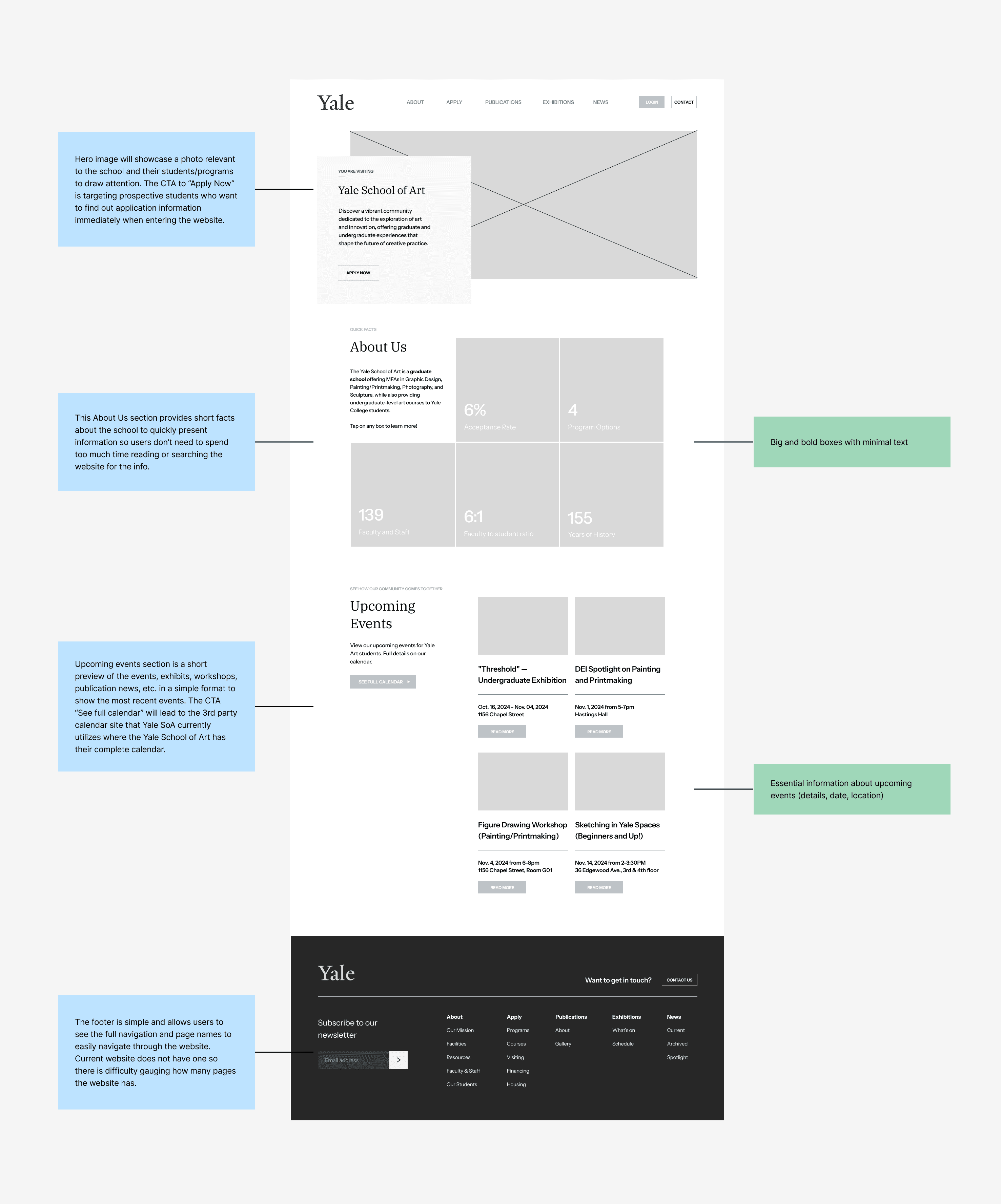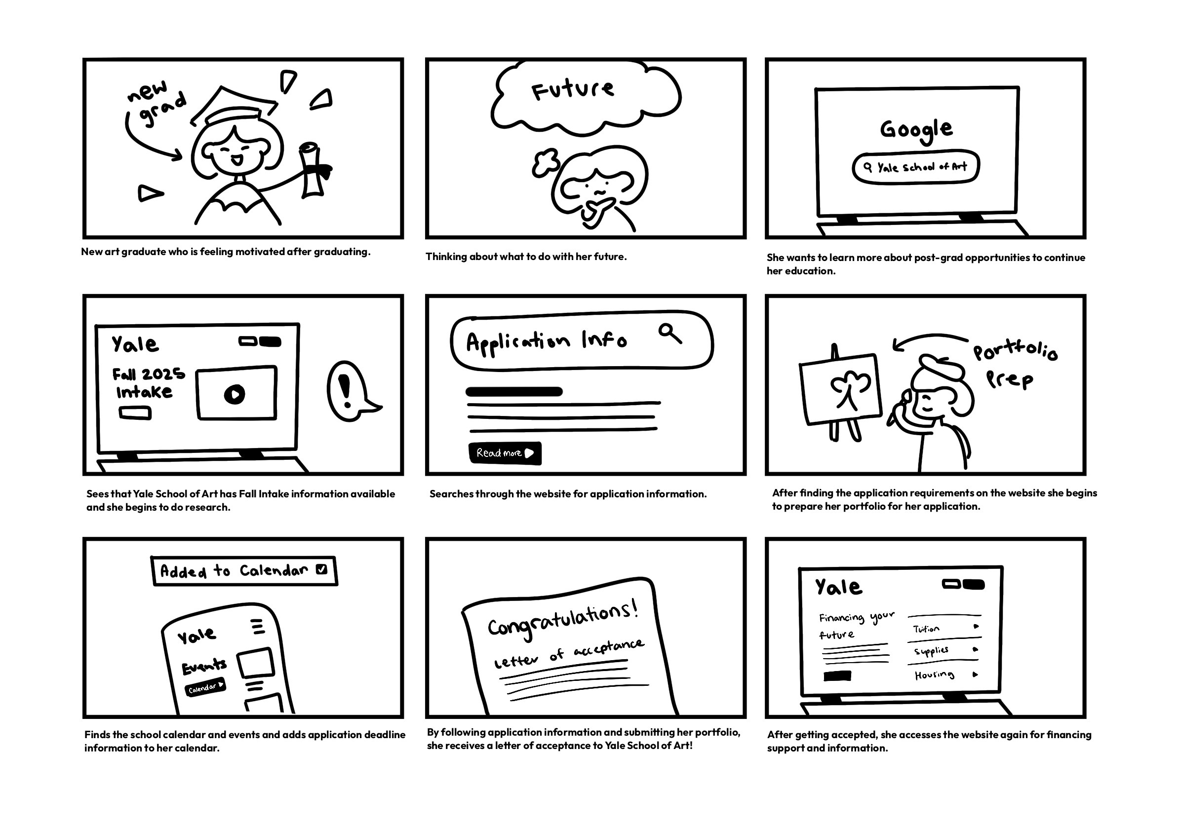 This storyboard highlights the importance of being able to navigate through the website to find important dates and information. At this stage, the goal is to visualize the content structuring that would be best suited for all user groups. As Yale School of Art is a graduate school, the main groups would be prospecting undergraduates and current students.
