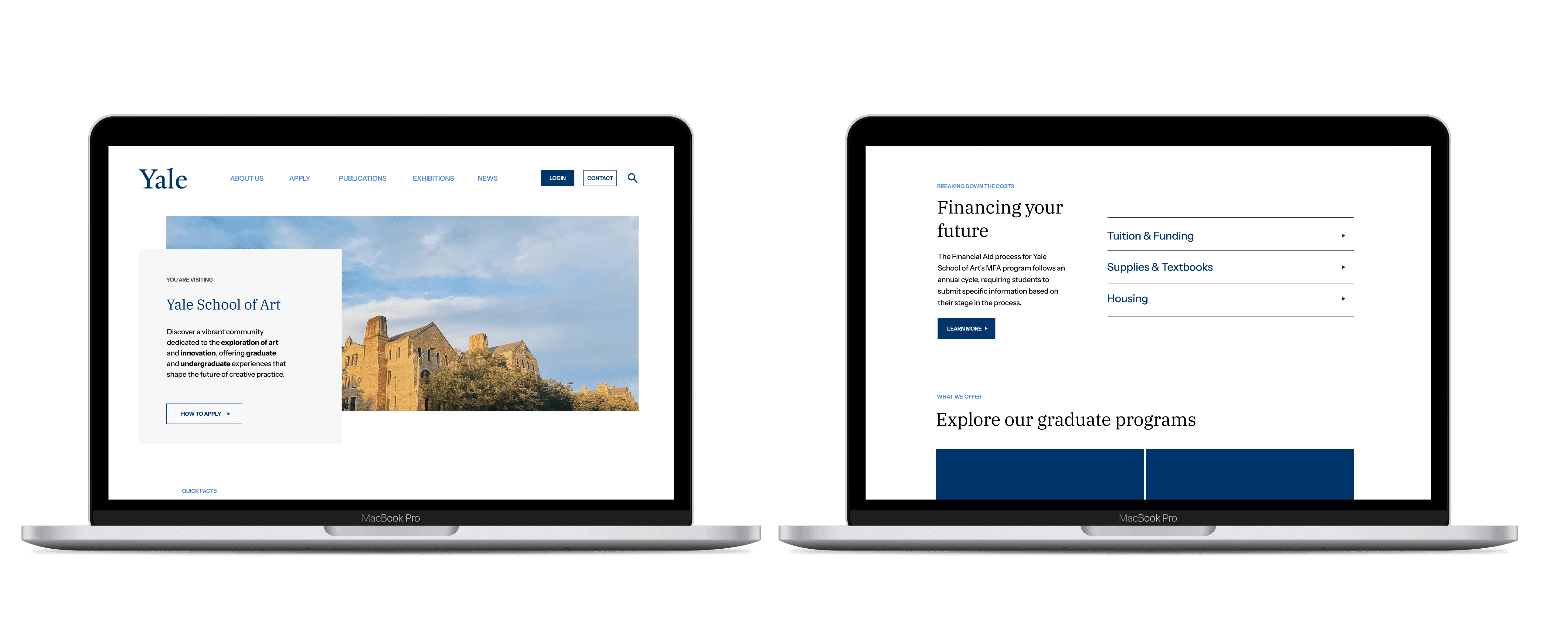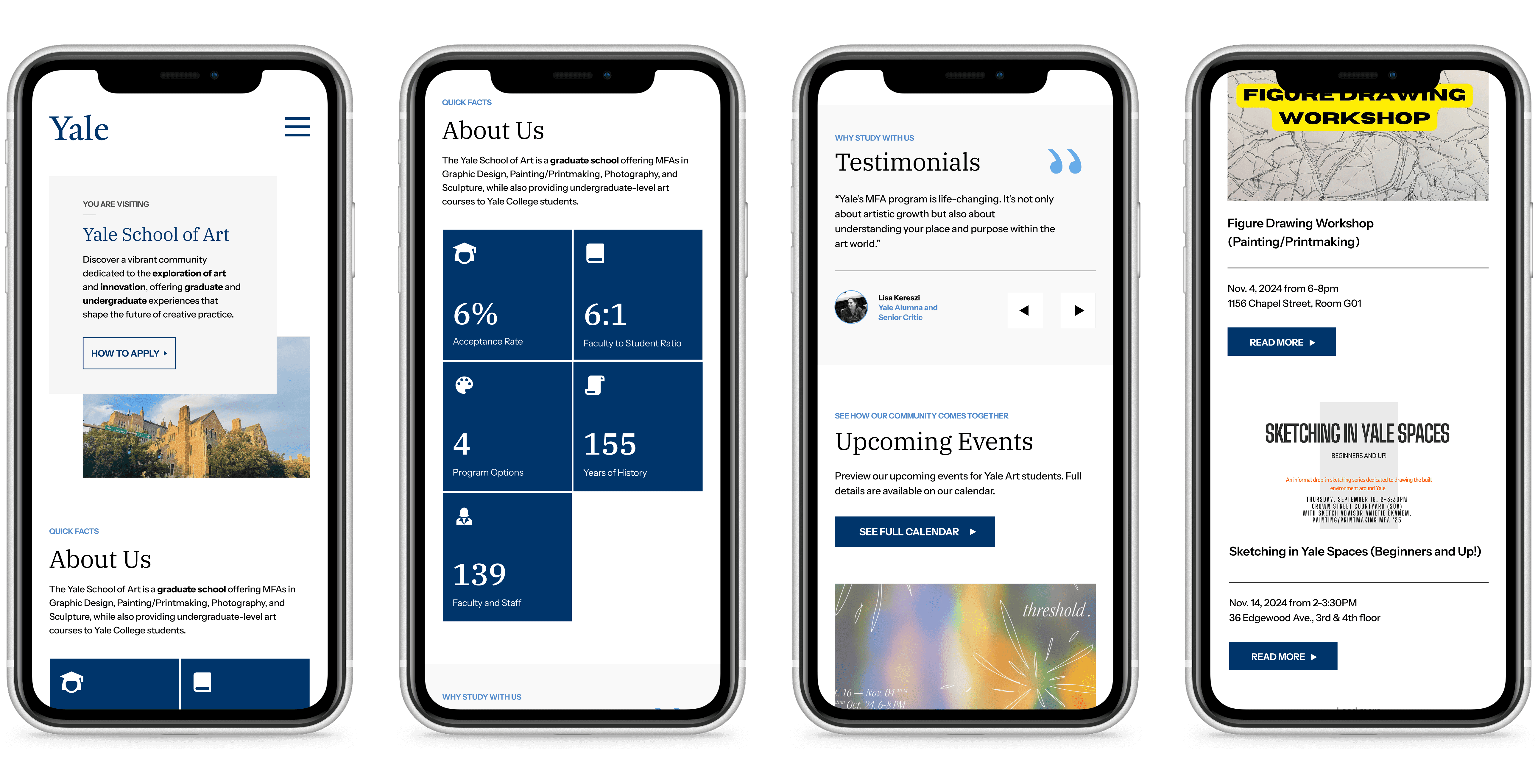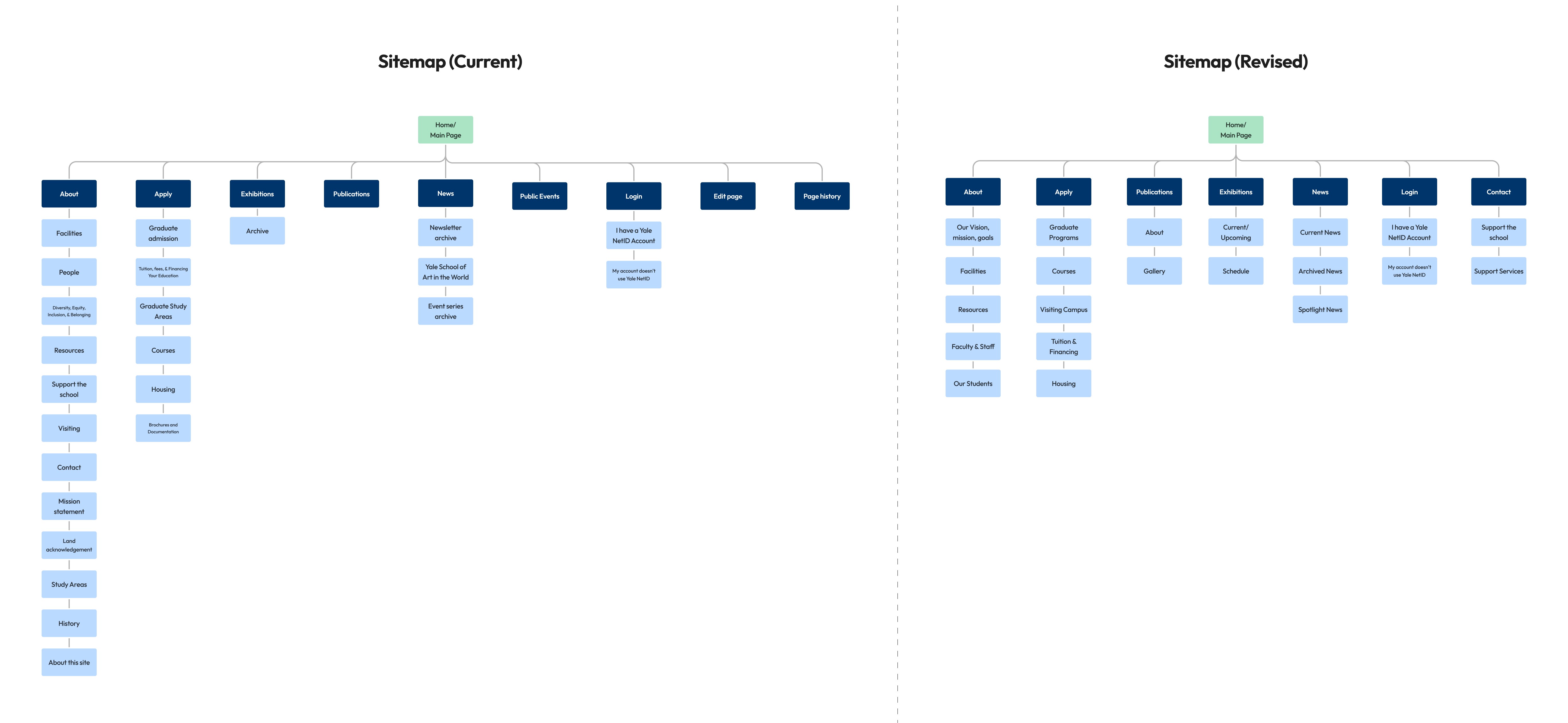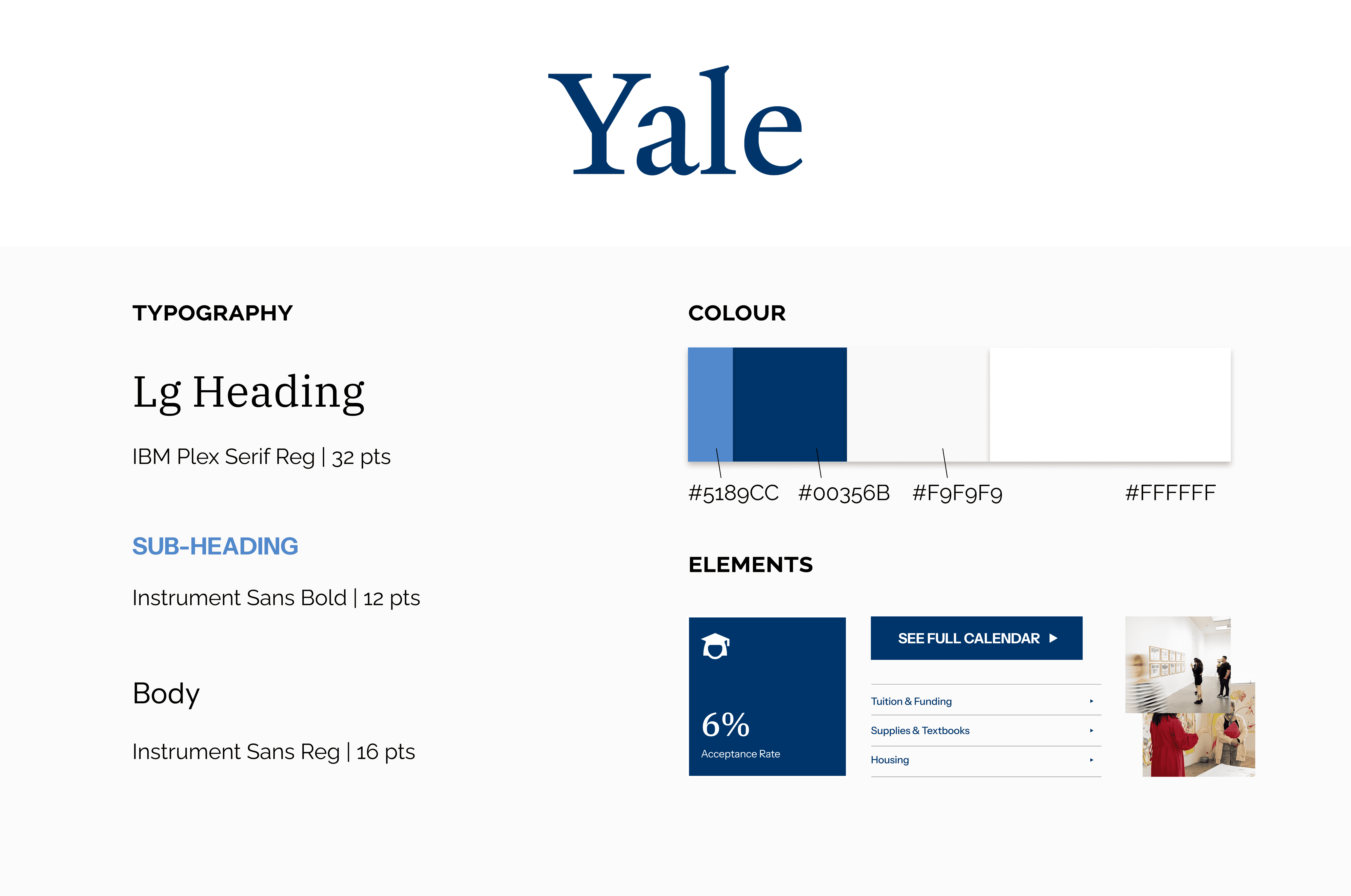 After reorganizing the sitemap, I developed a design plan for the redesign. One key visual issue in the current design is its failure to reflect Yale’s distinguished reputation. To address this, I referenced Yale’s official website to capture its prestigious and refined tone.